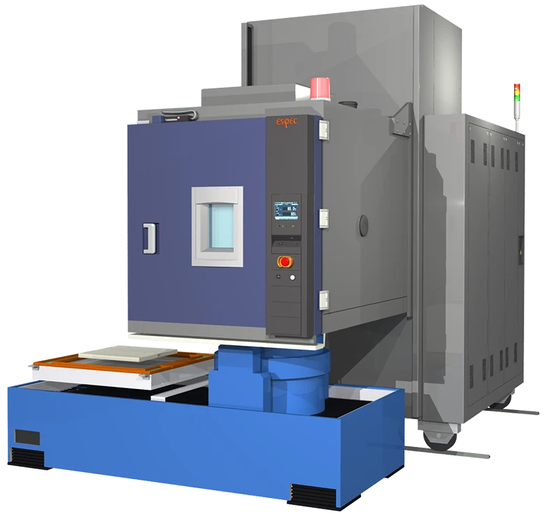 - In combined environmental testing, the temperature and humidity chamber and vibration test system operate sequentially, but each function can also be operated independently. This model enables temperature characteristic testing with the temperature and humidity chamber and vibration testing at ambient temperature.