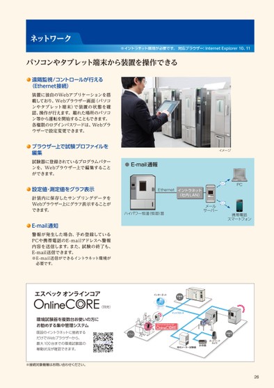 26遠隔監視/コントロールが行える(ETHERNET接続)装置に独自のWEBアプリケーションを搭載しており、WEBブラウザー画面(パソコンやタブレット端末)で装置の状態を確認、操作が行えます。離れた場所のパソコン等から運転を開始することもできます。各権限のログインパスワードは、WEBブラウザーで設定変更できます。ブラウザー上で試験プロファイルを編集試験器に登録されているプログラムパターンを、WEBブラウザー上で編集することができます。設定値・測定値をグラフ表示計装内に保存したサンプリングデータをWEBブラウザー上にグラフ表示することができます。E-MAIL通知警報が発生した場合、予め登録しているPCや携帯電話のE-MAILアドレスへ警報内容を送信します。また、試験の終了も、E-MAIL送信できます。※E-MAIL送信ができるイントラネット環境が必要です。パソコンやタブレット端末から装置を操作できるETHERNET無線LANによる接続例内蔵ワイヤレスダイレクトによる接続例プログラムパターンのコピーとPC編集携帯電話スマートフォンタブレットコントローラー(オプション)PC編集コピースタンダードタイプ急速温度変化タイプ小型環境試験器(WI-FI機能搭載)WI-FIルーター(オプション)スマートフォンスマートフォン小型環境試験器小型環境試験器ワイヤレスダイレクト(オプション)ハイパワー恒温(恒湿)器ETHERNET無線LANによる接続例WI-FIルーター(オプション)スマートフォンタブレット端末PCETHERNET携帯電話スマートフォンメールサーバーイントラネット(社内LAN)E-MAIL通報PCハイパワー恒温(恒湿)器イメージオフィス試験室A試験室Bネットワークカメラ計測器他社メーカー試験器OFFICESTESTAREABTESTAREAANETWORKCAMERAMEASURINGINSTRUMENTTESTCHAMBERSOFOTHERMANUFACTURERSイントラネットインターネットINTRANETINTERNET(別売)(SOLDSEPARATELY)ESPECONLINECORE環境試験器を複数台お使いの方にお勧めする集中管理システム既設のイントラネットに接続するだけでWEBブラウザーから、最大100台までの環境試験器の稼動状況が確認できます。ネットワーク※イントラネット環境が必要です。対応ブラウザー:INTERNETEXPLORER10、11※接続対象機種はお問い合わせください。