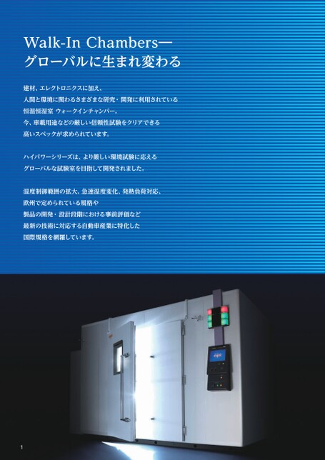 Walk-InChambers―グローバルに生まれ変わる建材、エレクトロニクスに加え、人間と環境に関わるさまざまな研究・開発に利用されている恒温恒湿室ウォークインチャンバー。今、車載用途などの厳しい信頼性試験をクリアできる高いスペックが求められています。ハイパワーシリーズは、より厳しい環境試験に応えるグローバルな試験室を目指して開発されました。温度制御範囲の拡大、急速温度変化、発熱負荷対応、欧州で定められている規格や製品の開発・設計段階における事前評価など最新の技術に対応する自動車産業に特化した国際規格を網羅しています。1