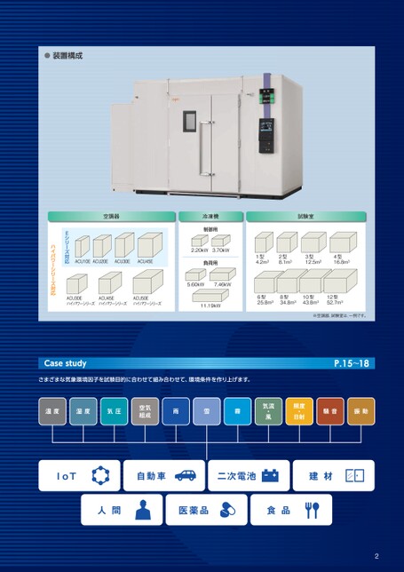 試験室1型4.2m32型8.1m33型12.5m34型16.8m36型25.8m38型34.8m310型43.8m312型52.7m3※空調器、試験室は、一例です。冷凍機制御用2.20kW3.70kW負荷用5.60kW7.46kW11.19kW空調器ACU10EACU20EACU30EACU45EEシリーズ対応ACU30EハイパワーシリーズACU45EハイパワーシリーズACU50Eハイパワーシリーズハイパワーシリーズ対応●装置構成P.15〜18騒音振動照度・日射気流・風温度湿度気圧空気組成雨雪霧Casestudyさまざまな気象環境因子を試験目的に合わせて組み合わせて、環境条件を作り上げます。IoT自動車二次電池建材人間医薬品食品2