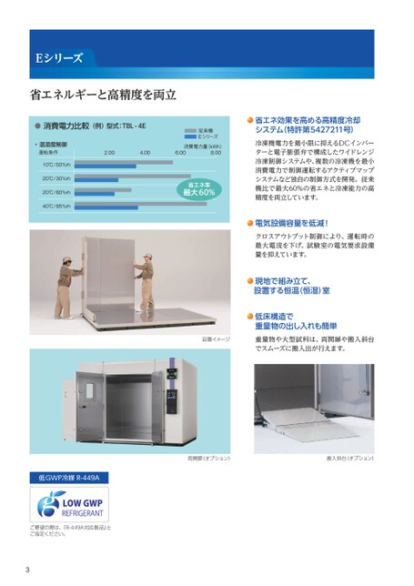 Eシリーズ省エネルギーと高精度を両立●消費電力比較(例)型式:TBL-4E従来機Eシリーズ消費電力量(kWh)6.008.00省エネ率最大60%省エネ効果を高める高精度冷却システム(特許第5427211号)冷凍機電力を最小限に抑えるDCインバーターと電子膨張弁で構成したワイドレンジ冷凍制御システムや、複数の冷凍機を最小消費電力で制御運転するアクティブマップシステムなど独自の制御方式を開発。従来機比で最大60%の省エネと冷凍能力の高精度を両立しています。電気設備容量を低減!クロスアウトプット制御により、運転時の最大電流を下げ、試験室の電気要求設備量を抑えています。現地で組み立て、設置する恒温(恒湿)室設置イメージ低床構造で重量物の出し入れも簡単重量物や大型試料は、両開扉や搬入斜台でスムーズに搬入出が行えます。両開扉(オプション)搬入斜台(オプション)2.004.00・温湿度制御運転条件10℃/50%rh20℃/30%rh20℃/80%rh40℃/95%rh低GWP冷媒R-449Aご要望の際は、「R-449A対応製品」とご指定ください。3