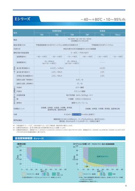 Eシリーズ型式電源-40〜+80℃・10〜95%rhTBE恒温恒湿室TBLTBRTBFAC200V3φ3W50/60Hz(定格電圧の±5%以内)恒温室TBUTBUU調温(調湿)方式平衡調温調湿方式(BTHCシステム)水蒸気分圧制御方式平衡調温方式(BTCシステム)冷凍方式運転可能外囲温湿度単段冷凍方式空冷凝縮器または水冷凝縮器5〜40℃/75%rhまで温度範囲※2-40〜+80℃-30〜+80℃-10〜+80℃-40〜+80℃-30〜+80℃-10〜+80℃10〜95%rh(at+10〜+80℃)20〜95%rh(at+20〜+80℃)±0.5℃/±4%rh2.5℃/8%rh2.5℃/8%rh─±0.5℃2.5℃2.5℃0.4℃/分1℃/分カラー鋼板ステンレス鋼板等分布荷重:6kPa(600kgf/m2)片開扉W850×H1800mm硬質ウレタンフォーム送風機、加熱器、加湿器、冷凍機、蒸発器、温度検出端、湿度検出端送風機、加熱器、冷凍機、蒸発器、温度検出端R-404A〔低GWP冷媒R-449Aに変更可〕空間温(湿)度偏差※3温度変化速度下降時間※3温度変化速度上昇時間※3湿度範囲※2温(湿)度変動※3温(湿)度勾配※3性能※1外装材内装材床面耐荷重扉断熱材(工場量産パネル組立式)本体空調器ユニット冷媒標準装備品●フロストフリー拡大(オプション)による温湿度制御範囲換気扇、Ethernetポート(LANポート)、外部出力端子扉観測窓(W180×H289mm)、ケーブル孔φ50mm、室内灯(LED)、※1外囲温度が+5〜+32℃、冷却水温が+25〜32℃で無負荷、無試料時の場合とします。※2試験室性能表記は、温(湿)度検出端(空気調和器の吹出口に設置)とします。※3試験室性能表記は、温度室がJISC60068-3-5:2006(IEC60068-3-5:2001)及びJTMK07:2007、湿度室がJISC60068-3-6:2008(IEC60068-3-6:2001)及びJTMK09:2009(恒温恒湿室)に基づきます。温湿度制御範囲(Eシリーズ)【標準仕様】95100【オプション仕様】OP:フロストフリー拡大(低湿度装置)10095フロストフリー範囲4050温度(℃)TBLTBE60708090TBR※TBL、TBEの制御範囲(黄色部分)を拡大し、全域をフロストフリー(斜線)にすることができます。※斜線範囲外もご相談ください。48060全域フロストフリー湿度(%rh)4060708090010203020OP4050温度(℃)フロストフリー範囲TBRTBE二元※温度運転時は+15℃以上がフロストフリー範囲となります。TBLTBE2001020308060湿度(%rh)40