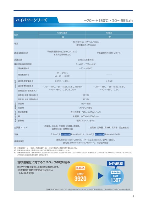 ハイパワーシリーズ-70〜+150℃・20〜95%rh恒温恒湿室TBE恒温室TBFAC200V3φ3W50/60Hz(定格電圧の±5%以内)平衡調温調湿方式(BTHCシステム)水蒸気分圧制御方式平衡調温方式(BTCシステム)水冷二元冷凍方式5〜40℃/75%rhまで-70〜+150℃20〜95%rh(at+20〜+80℃)±0.5℃/±4%rh─±0.5℃ー70〜ー41℃,+81〜150℃:5.5℃/8.0%rhー40〜+80℃:2.5℃/8.0%rhー70〜ー41℃,+81〜150℃:5.5℃ー40〜+80℃:2.5℃3℃/分4℃/分カラー鋼板ステンレス鋼板等分布荷重:6kPa(600kgf/m2)片開扉W850×H1800mm硬質ウレタンフォーム送風機、加熱器、加湿器、冷凍機、蒸発器、温度検出端、湿度検出端送風機、加熱器、冷凍機、蒸発器、温度検出端7.5kW2元低GWP冷媒R-449A+R-23、15kW2元低GWP冷媒R-449A+R-508A扉観測窓(W180×H289mm)、ケーブル孔φ50mm、室内灯(LED)、換気扇、Ethernetポート(LANポート)、外部出力端子調温(調湿)方式冷凍方式運転可能外囲温湿度温度範囲※2湿度範囲※2温(湿)度変動※3温(湿)度勾配※3性能※1空間温(湿)度偏差※3温度変化速度下降時間※3温度変化速度上昇時間※3型式電源外装材内装材床面耐荷重扉断熱材(工場量産パネル組立式)本体空調器ユニット冷媒標準装備品※1外囲温度が+5〜+32℃、冷却水温が+25〜32℃で無負荷、無試料時の場合とします。※2試験室性能表記は、温(湿)度検出端(空気調和器の吹出口に設置)とします。※3試験室性能表記は、温度室がJISC60068-3-5:2006(IEC60068-3-5:2001)及びJTMK07:2007、湿度室がJISC60068-3-6:2008(IEC60068-3-6:2001)及びJTMK09:2009(恒温恒湿室)に基づきます。地球温暖化に対するエスペックの取り組み低GWP冷媒を使用した製品をご提供します。(地球温暖化係数が従来より64%低いR-449Aを使用)R-404AGWP392064%削減R-449AGWP1397ご注文の際は「R-449A対応製品」とご指定ください。[出典]R-404AのGWP:フロン排出抑制法ポータルサイト平成30年度報告用。R-449AのGWP:Chemours社HP8