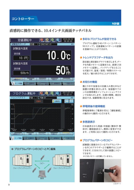 コントローラー直感的に操作できる、10.4インチ大画面タッチパネルN計装多彩なプログラムが設定できるプログラム運転で40パターン(1パターン99ステップ)、定値運転3パターンの試験を登録することができます。トレンドグラフデータを出力設定値と測定値をグラフで表示します。データを内部メモリーに記録または、直接USBメモリーに記録し、バックアップをとることも可能です。温度/湿度/時間のスケールを拡大/縮小表示することができます。お知らせ機能霜とり中や加湿水の自動入れ替え中など装置の状態を表示します。加湿器やフロンの点検時期をインフォメーションアイコンでお知らせします。任意の期間、項目を設定でき、装置管理に役立ちます。停電時後の復帰機能停電復帰時に「電源を切る」「運転継続」の動作から選択いただけます。多言語表示日本語表示から英語・中国語(簡体字・繁体字)・韓国語表示へ、簡単に変更ができます。ご利用に応じて選択いただけます。プログラムパターンのコピー試験器に登録されているプログラムパターンをPCのブラウザー上で編集することができます。USBを介して別の装置にコピーできます。※USBメモリーは付属していません。●E-mail通報メールサーバーEthernetイントラネット(社内LAN)ウォークインチャンバーPC携帯電話スマートフォンプログラムパターンのコピーとPC編集コピーウォークインチャンバーウォークインチャンバー編集9USBポート