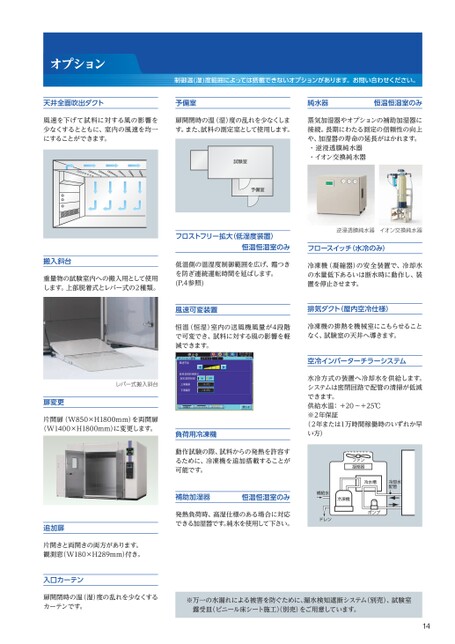 オプション制御温(湿)度範囲によっては搭載できないオプションがあります。お問い合わせください。天井全面吹出ダクト予備室風速を下げて試料に対する風の影響を少なくするとともに、室内の風速を均一にすることができます。扉開閉時の温(湿)度の乱れを少なくします。また、試料の測定室として使用します。試験室ファン凝縮器冷水槽予備室冷却水配管補給水冷凍機ポンプドレンフロストフリー拡大(低湿度装置)純水器恒温恒湿室のみ蒸気加湿器やオプションの補助加湿器に接続。長期にわたる測定の信頼性の向上や、加湿器の寿命の延長がはかれます。・・イオン交換純水器逆浸透膜純水器補給ド逆浸透膜純水器イオン交換純水器恒温恒湿室のみフロースイッチ(水冷のみ)低温側の温湿度制御範囲を広げ、霜つきを防ぎ連続運転時間を延ばします。(P.4参照)試験室空冷チラー風速可変装置予備室恒温(恒湿)室内の送風機風量が4段階で可変でき、試料に対する風の影響を軽減できます。負荷用冷凍機動作試験の際、試料からの発熱を許容するために、冷凍機を追加搭載することが可能です。搬入斜台重量物の試験室内への搬入用として使用します。上部脱着式とレバー式の2種類。レバー式搬入斜台扉変更片開扉(W850×H1800mm)を両開扉(W1400×H1800mm)に変更します。試験室予備室追加扉片開きと両開きの両方があります。観測窓(W180×H289mm)付き。入口カーテン試験室扉開閉時の温(湿)度の乱れを少なくするカーテンです。予備室冷凍機(凝縮器)の安全装置で、冷却水の水量低下あるいは断水時に動作し、装置を停止させます。空冷排気ダクト(屋内空冷仕様)冷凍機の排熱を機械室にこもらせることなく、試験室の天井へ導きます。空冷インバーターチラーシステム水冷方式の装置へ冷却水を供給します。システムは密閉回路で配管の清掃が低減できます。供給水温:+20〜+25℃※2年保証(2年または1万時間稼働時のいずれか早い方)ファン凝縮器冷水槽冷却水配管補助加湿器恒温恒湿室のみ補給水冷凍機発熱負荷時、高湿仕様のある場合に対応できる加湿器です。純水を使用して下さい。ドレンポンプ※万一の水漏れによる被害を防ぐために、漏水検知遮断システム(別売)、試験室露受皿(ビニール床シート施工)別売)をご用意しています。空冷チラー14