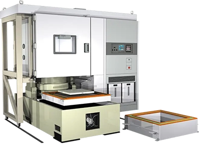 「垂直/水平加振 複合環境試験装置」は、垂直テーブルと水平テーブルを前後に装備した振動試験機の上を、チャンバー本体がスライド移動、上下昇降することで、垂直加振複合試験と、従来、常温で行っていた水平加振複合試験を一台の試験装置で行えるようにした装置です。