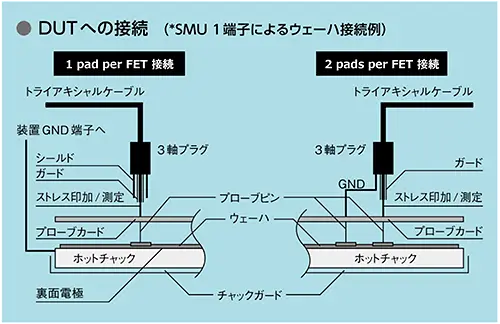 例えば、ウェーハ表面上のコンタクトパッド(Gate)部と裏面(GND)間や、ウェーハ表面上部の2つのコンタクトパッド間(例:Gate-GND)間の濡れ電流の測定がSMU 1端子で測定可能です。