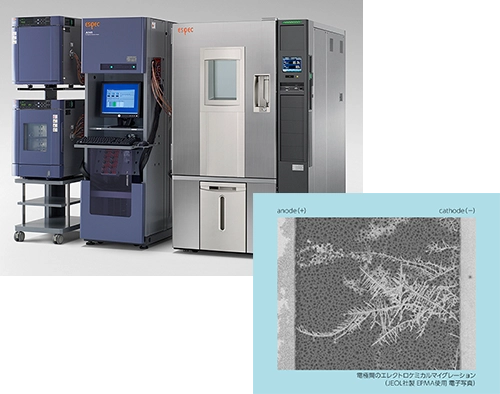 プリント基板の高密度実装や消費電力の増大、電極間距離の縮小によりエレクトロケミカルマイグレーションが発生しやすい状況が増えております。エスペックでは最大2.5KV印可時の絶縁抵抗が常時モニターできる装置を保有し、基材や配線パターンの絶縁性評価をサポートいたします。