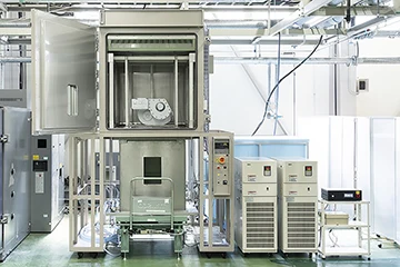 従来の試験方法では、恒温槽内に固定した供試品を高温にさらした後、作業者が水槽をリフトアップして、供試品を水中に浸漬することで、高温になったシステム/コンポーネントに冷水がかかる状態を創り出していました。